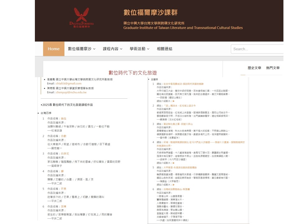 近年來強化人文和歷史認識的「文化旅遊」,已成為當代臺灣旅遊的新趨勢。因此,教導人文科系的學生在網路發達的現今,利用數位技術,將人文知識轉化為更親近大眾的資訊,是十分重要的。本課程結合清領和日治時期文學作品的深度閱讀,與數位技術的教學,並首次導入AI。學生學習掌握文學作品所蘊藏的豐厚文化意涵,善用數位資料庫,結合網站和AI數位技術,企畫與製作具深度文化傳播的文案,是一門理論和實踐並重的課程。