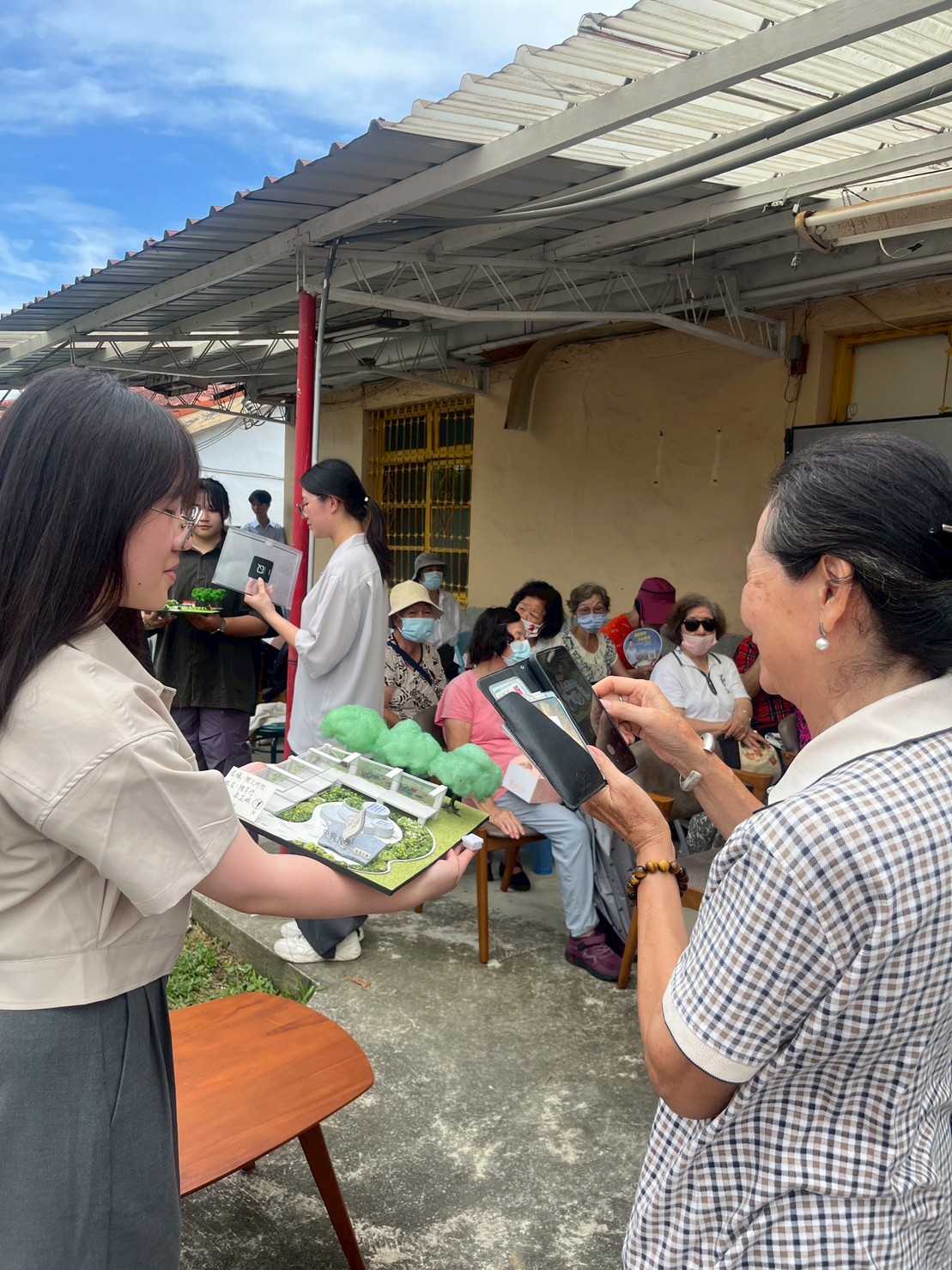 本學期課程設計結合南投分部校園環境提升議題,擇取一綠地空間讓學生自由發揮設計想像,如何透過設計建構舒適動線與多元使用機能的綠地空間,並將成果展直接辦在南投分部房舍庭院,邀請地方居民一同參與。居民對學生提出的空間改善構想多表肯定,並於FB中分享修課學生設計表現,並提供實際使用經驗作為回饋,透過互相討論交流意見讓設計更貼近在地需求,落實、強化場域連結與問題導向的教學實踐精神。