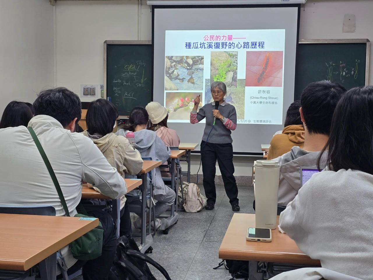 課程設計採用問題導向學習(PBL)模式,學生在課堂上深入探討全球生態環境挑戰,並親赴種瓜溪進行現地參訪與生態調查。我們特別邀請計畫主持人許秋容教授,到課堂分享種瓜溪復育的心路歷程,藉此強調在生態復育與評估的真實案例中,必須在堅實的科學數據基礎上,透過多方利害關係者溝通與合作,方能達成共利共榮的政策決定。