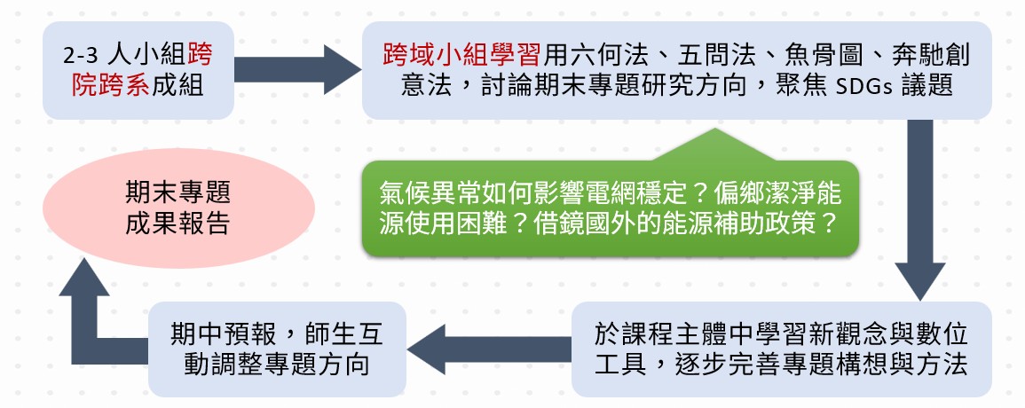 本課程結合資料探勘技術與STEAM教育元素,涵蓋資料科學(Science)與AI演算法(Math),並透過電腦資訊工程技術(Engineering)與資訊科技工具(Technology)的實作,引導學生探索聯合國永續發展目標(SDG 7 清潔能源與SDG 13 氣候行動)。學生將與不同科系的同學合作,運用資料倉儲、分類、分群及關聯分析等技術,分析智慧電網與綠能發電模式,優化能源調配以提升效率,最終於期末專題利用奔馳創意法等分享創新解決方案與實作成果,培養跨領域的問題解決能力。同時,課程鼓勵學生參與國內外競賽,如Kaggle資料分析競賽,以強化資料探勘技術的應用,推動創新思維與自主學習,將所學知識落實於社會需求,助力全球永續發展目標的實現。