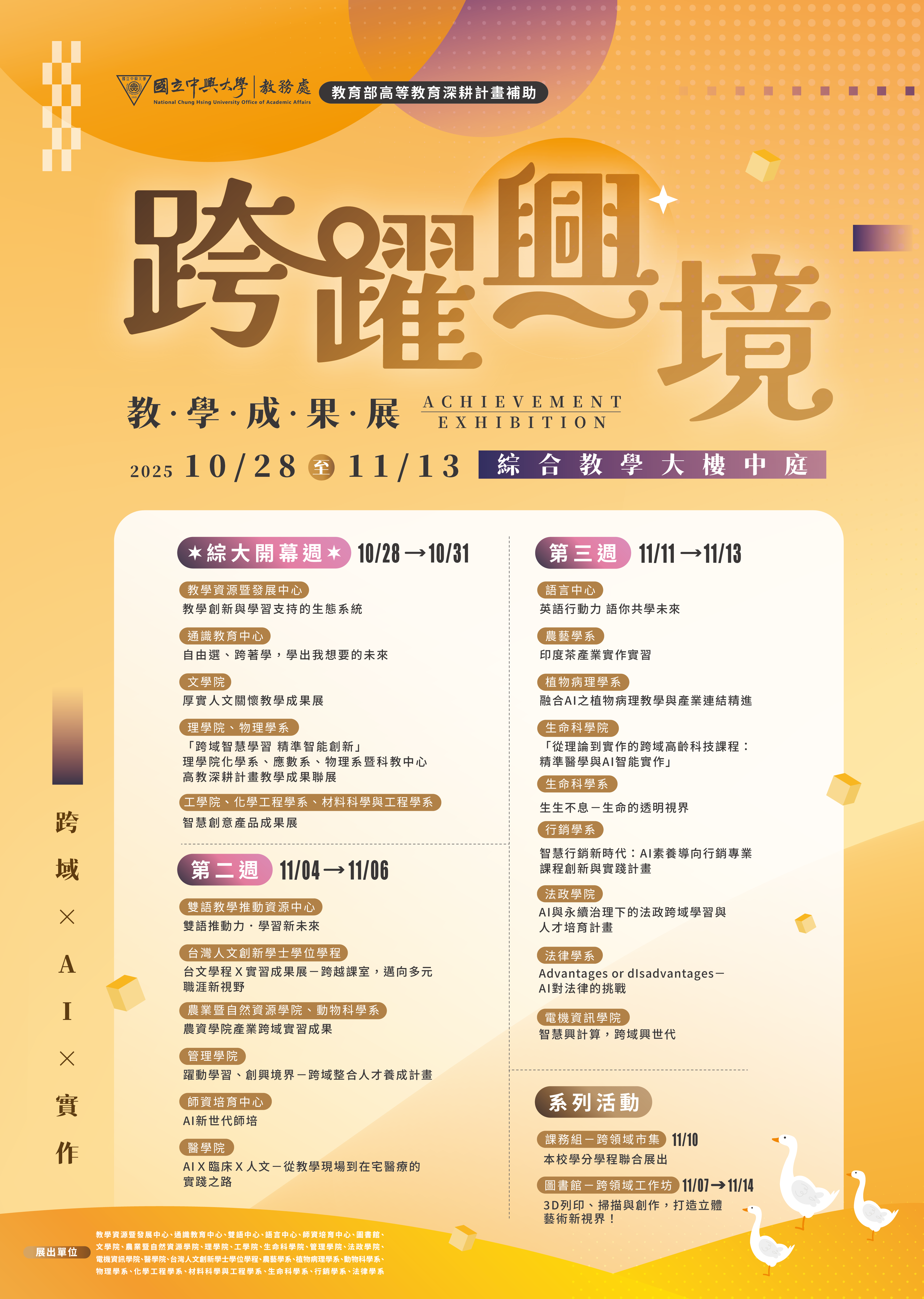 展出單位:教學資源暨發展中心、通識教育中心、雙語教學推動資源中心、語言中心、師資培育中心、圖書館、文學院、農業暨自然資源學院、理學院、工學院、生命科學院、管理學院、法政學院、電機資訊學院、醫學院、台灣人文創新學士學位學程、農藝學系、植物病理學系、動物科學系、物理學系、化學工程學系、材料科學與工程學系、生命科學系、行銷學系、法律學系。
