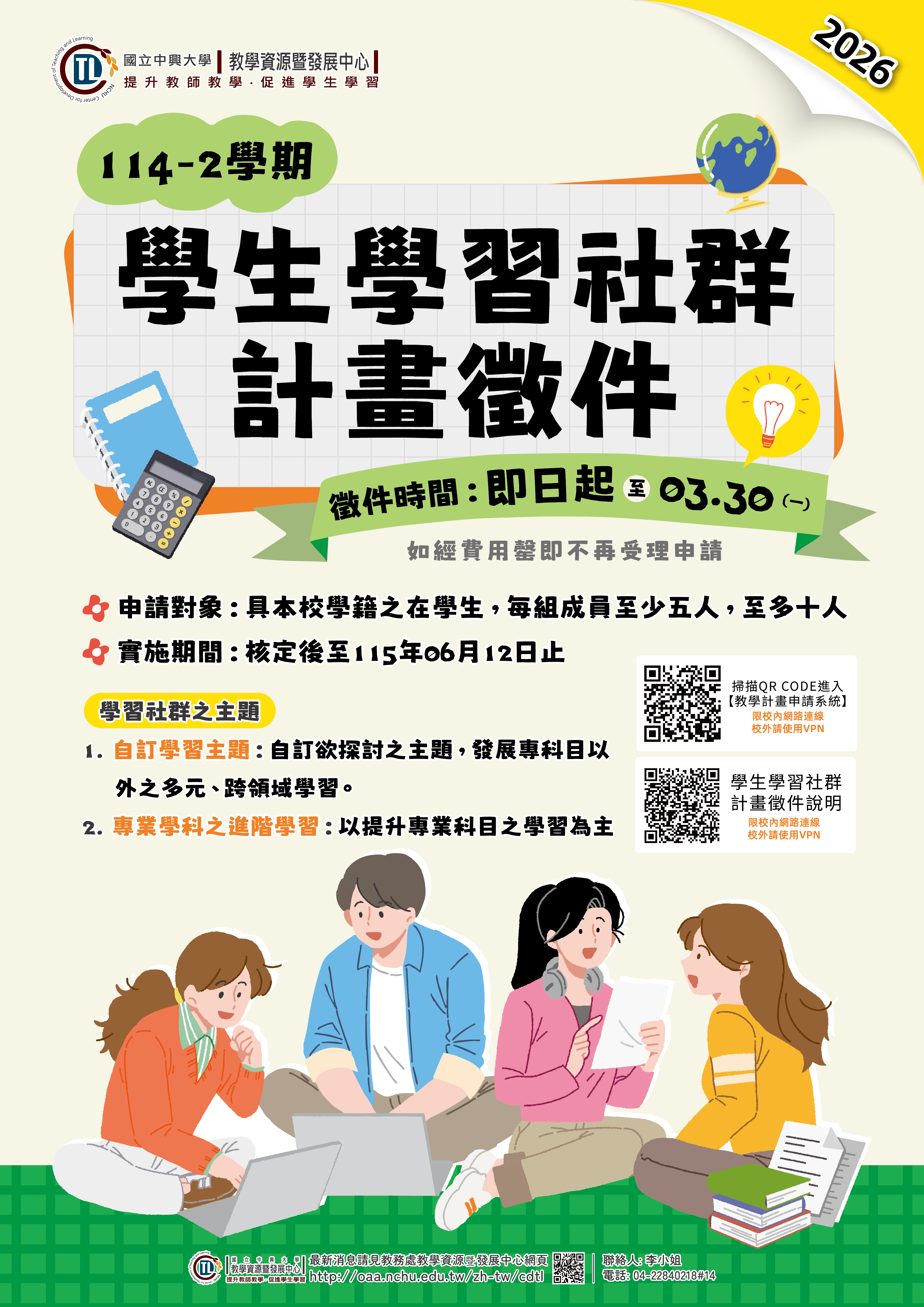 114-2 學生學習社群計畫受理申請至115年3月30日止