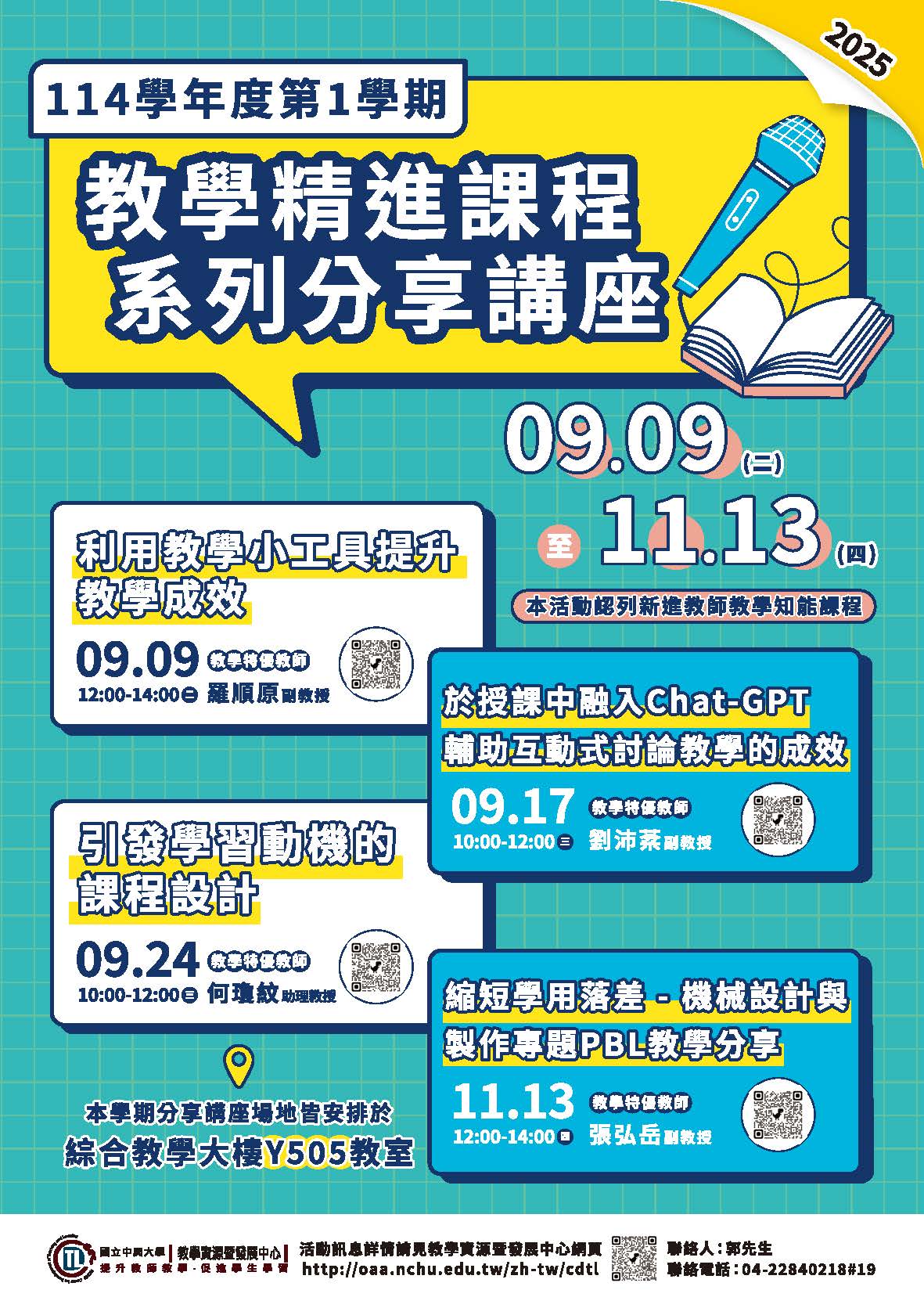 | 2025/9/9(二) | 12:00-14:00 | 114-1教學分享講座:利用教學小工具提升教學成效 | 中興大學羅順原副教授 | 綜大505 | 1 | 已截止 | |