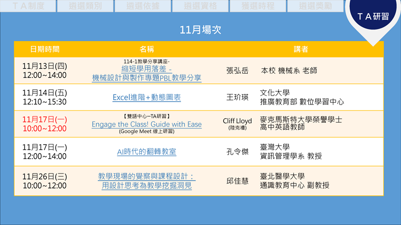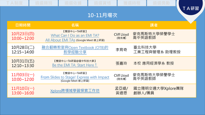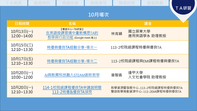 10月17日(五)「特優&優良TA經驗分享-場次二」:邀請113-2校院級課程特優及優良TA及EMI課程特優及優良TA分享輔助教學之技巧與心得。報名連結