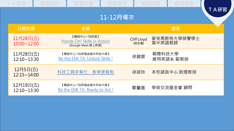 教發中心將於下列時間辦理TA研習活動: