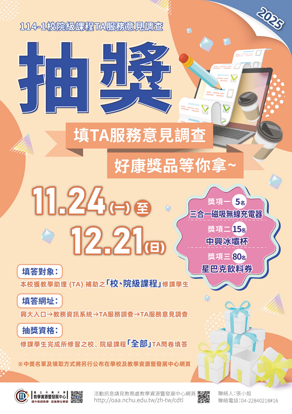 - 114-1校院級課程-填TA服務意見調查,好康獎品等你拿~