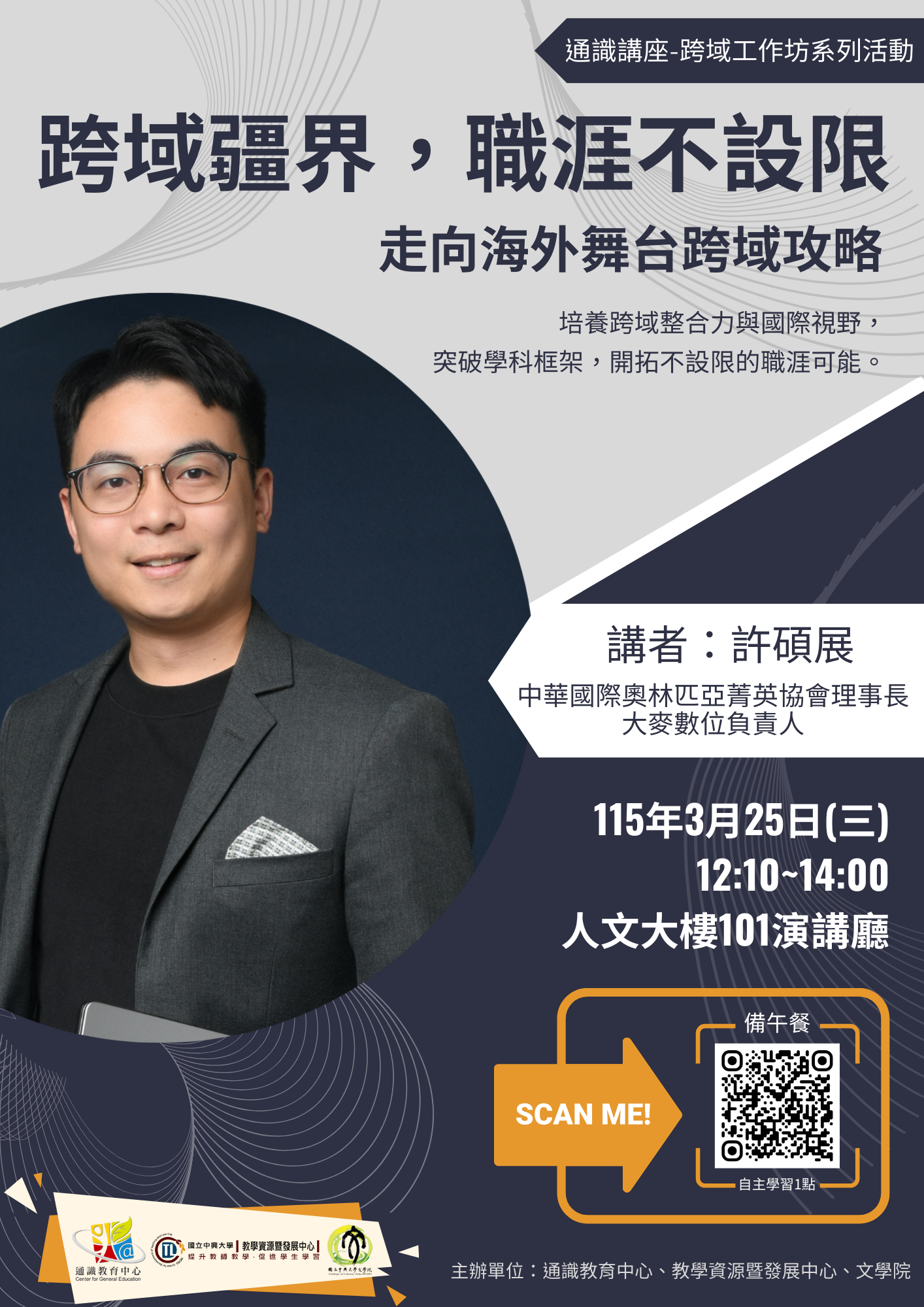 - 【跨域學習工作坊系列活動】通識講座:跨域疆界,職涯不設限-走向海外舞台跨域攻略