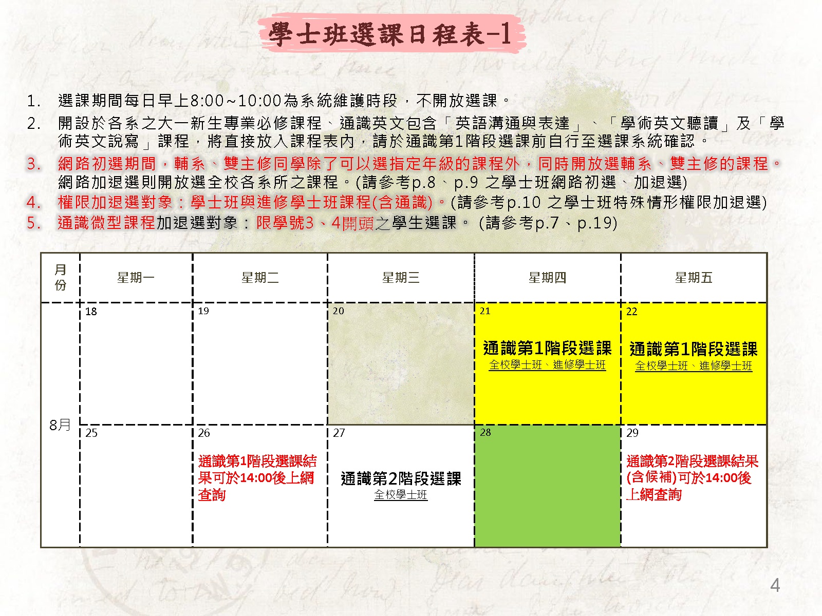 4.學士班 、進修學士班可於「網路加退選(開學第1週)」期間直接於選課系統中日夜互選通識課程(免日夜互選單 )。