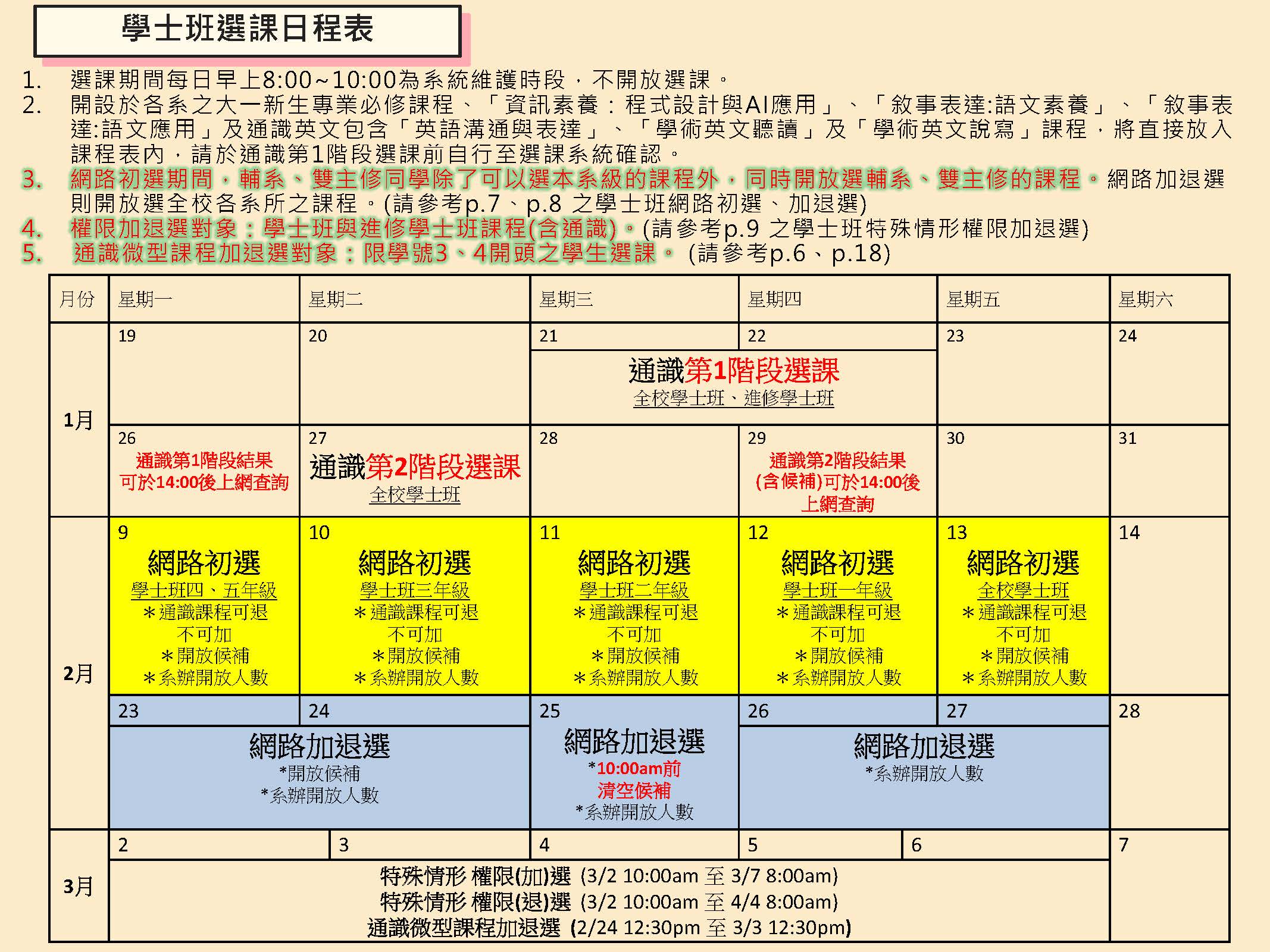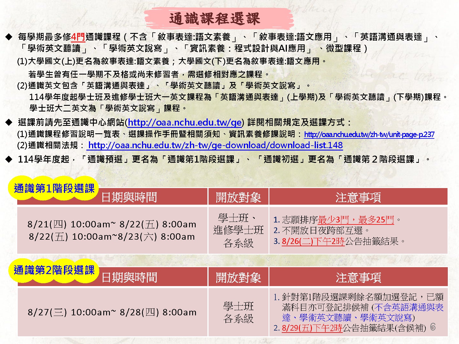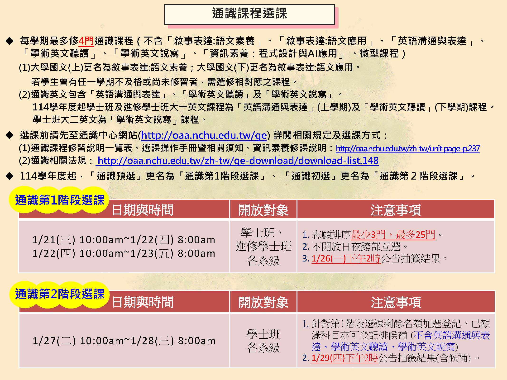 (註:114學年度起「通識預選」更名為「通識第1階段選課」、「通識初選」更名為「通識第2階段選課」)